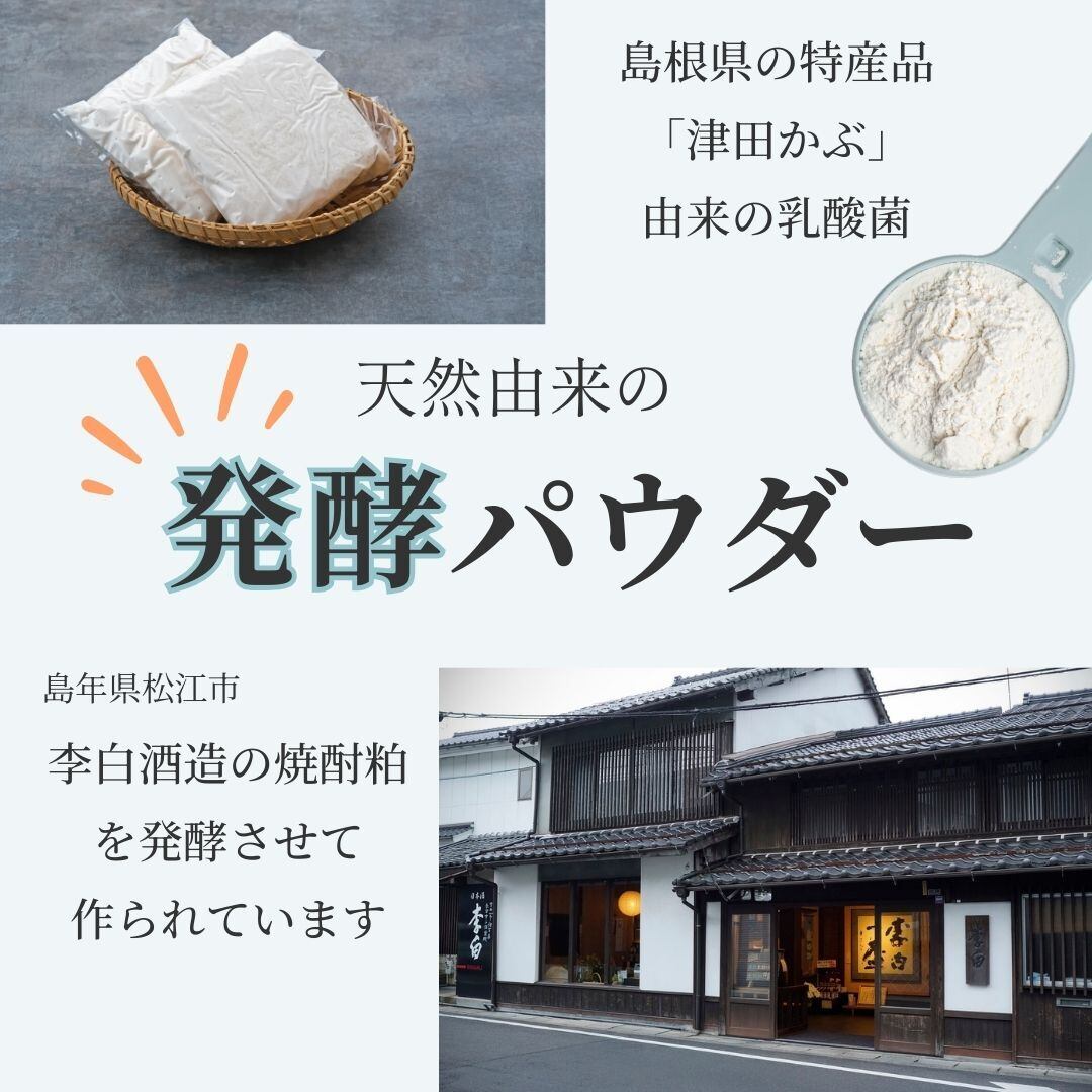 ・島根県の特産品「津田かぶ」由来の乳酸菌で松江市の李白酒造会社の焼酎粕を発酵させて作った天然由来の発酵パウダーで「旨味・栄養」が凝縮されています。こちらにも